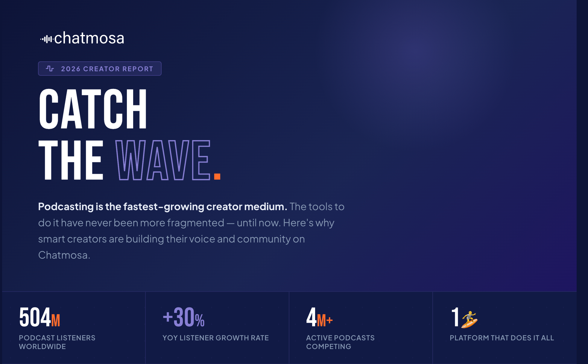 Together with CEO - Camille, CTO - Sandra, and Head of Growth - Derek, we are building Chatmosa to make podcasting, live conversations, and community-driven media simpler and more interactive.